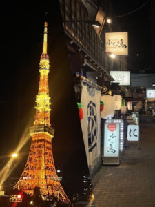 Walk to Shiba Park and enjoy a breathtaking view of Tokyo Tower surrounded by greenery. - 7:40 PM – Arrive in Tamachi / 1st Izakaya
